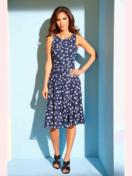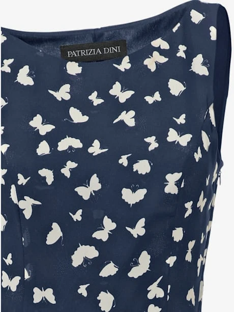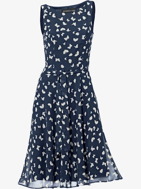 Robe imprimé papillon tendance. Haut ajusté sans manches, partie jupe évasée. Avec ceinture à nouer. Matière agréable à porter.