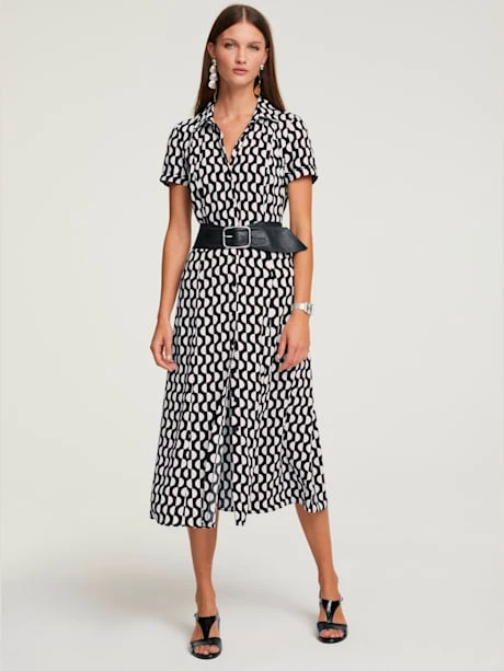 Robe-chemisier ornée d’un motif imprimé moderne. Coupe ample flatteuse, patte de boutonnage sur toute la longueur, manches courtes. Ceinture à nouer assortie incluse.