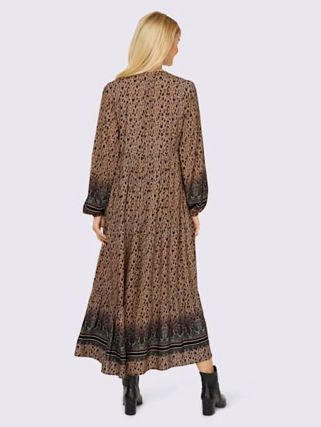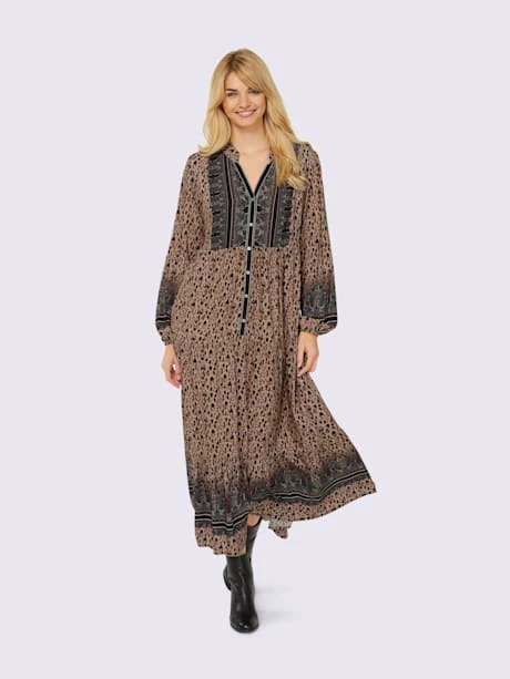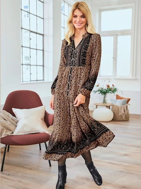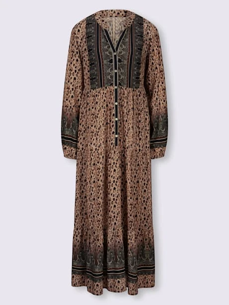 Robe au joli mélange d’imprimés léopard et de détails paisley. Encolure en V avec col montant et patte de boutonnage. Manches longues à la finition élastiquée.