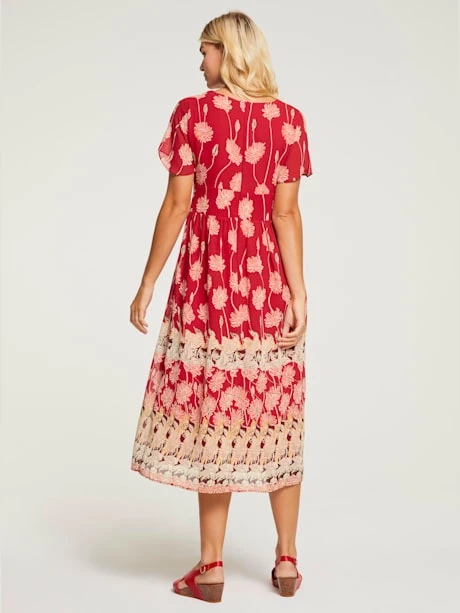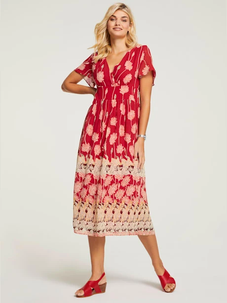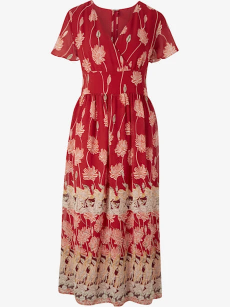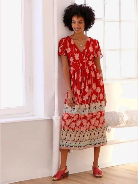 Robe imprimée en qualité fluide et légère, joli motif floral. Coupe princesse, haut flatteur, couture sous la poitrine et jupe évasée. Encolure en V, manches courtes et glissière discrète.