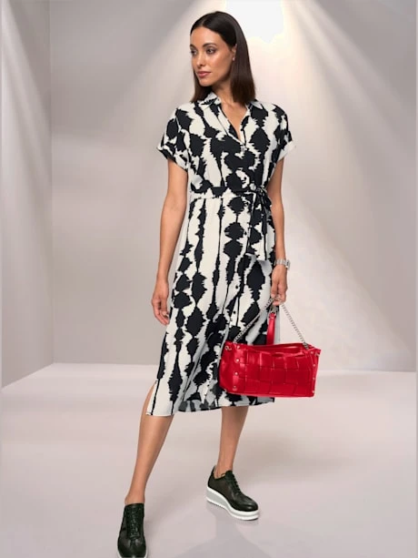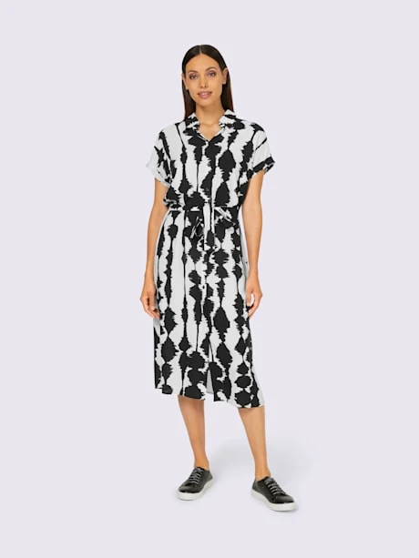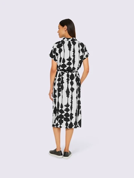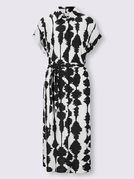 Robe tendance au motif imprimé abstrait. Col chemisier et patte de boutonnage sur toute la longueur. Manches courtes à revers. Fente devant. Livré avec la ceinture à nouer.