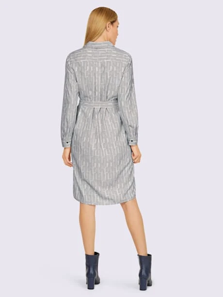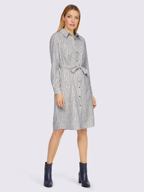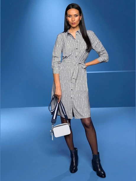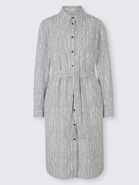 Robe au superbe motif imprimé tendance. Col chemise élégant et poches poitrines plaquées. Patte de boutonnage sur toute la longueur et poches latérales cousues. Manches longues à manchettes boutonnées. Pli décoratif au dos. Qualité fluide et tissée. Ceinture à nouer.