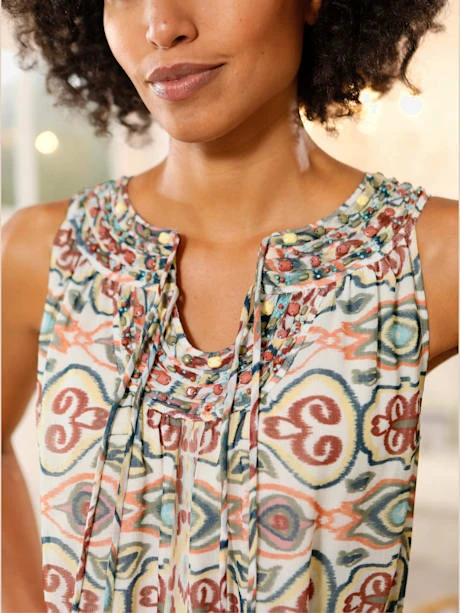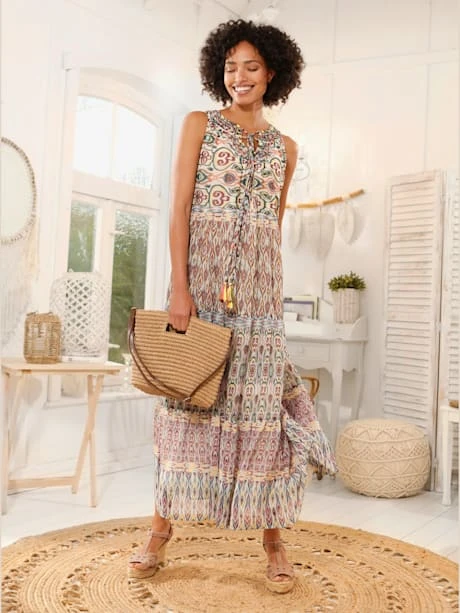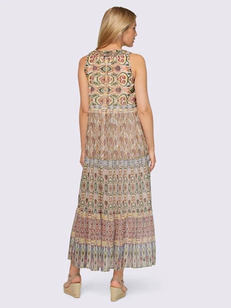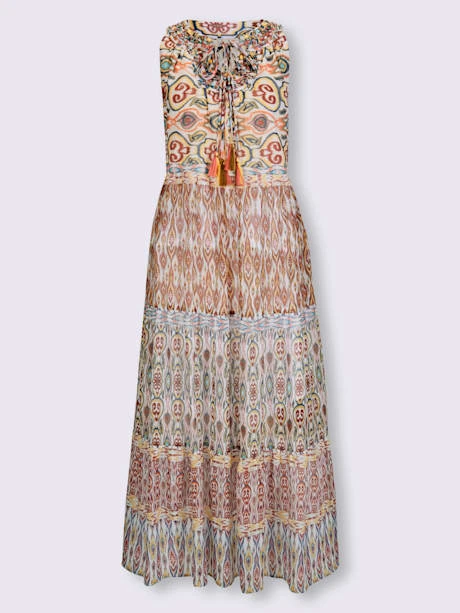 Robe longue ornée d’un joli motif ultra-tendance. Partie jupe évasée à plusieurs niveaux. Doublure opaque. Encolure ronde avec pierres fantaisie et liens à nouer. Sans manches tendance. Polyester recyclé.