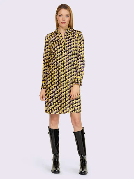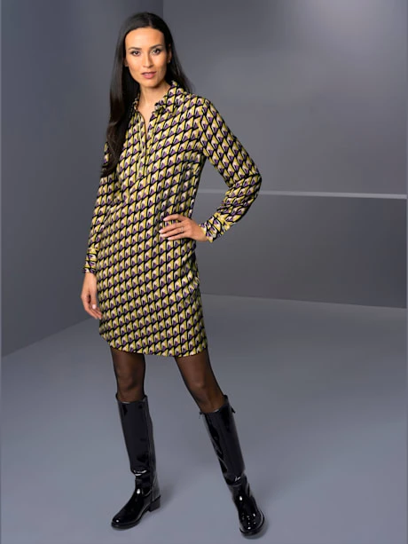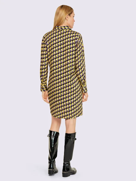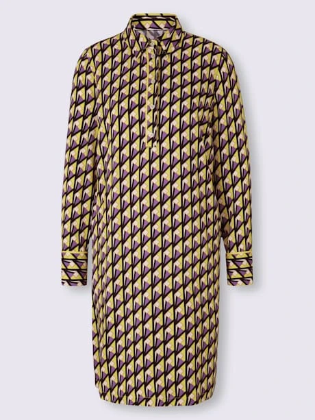 Robe imprimée en qualité tissée et motif graphique tendance. Col chemise et pinces poitrine structurantes. Patte de boutonnage courte avec passepoils contrastés et boutons imitation nacre. Manches longues et manchettes boutonnées.