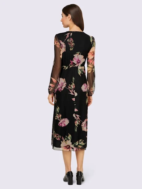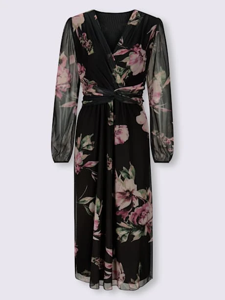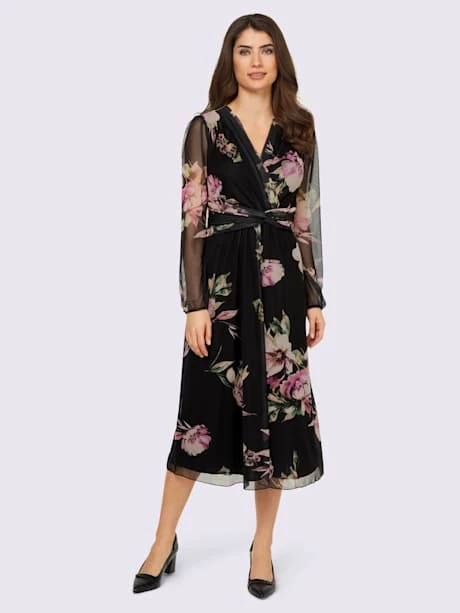 Robe féminine ornée d’un ravissant imprimé floral. Doublure. Encolure en V à l’effet cache-cœur tendance et ceinture nouée à la taille. Manches longues légèrement transparentes et finition élastiquée. Longueur mollet.