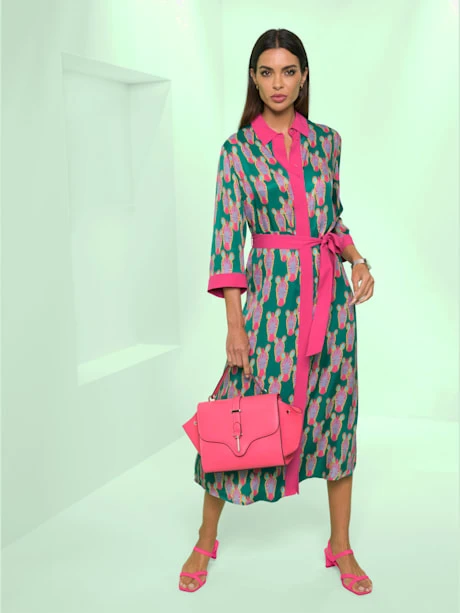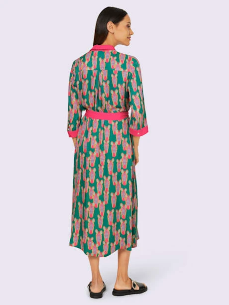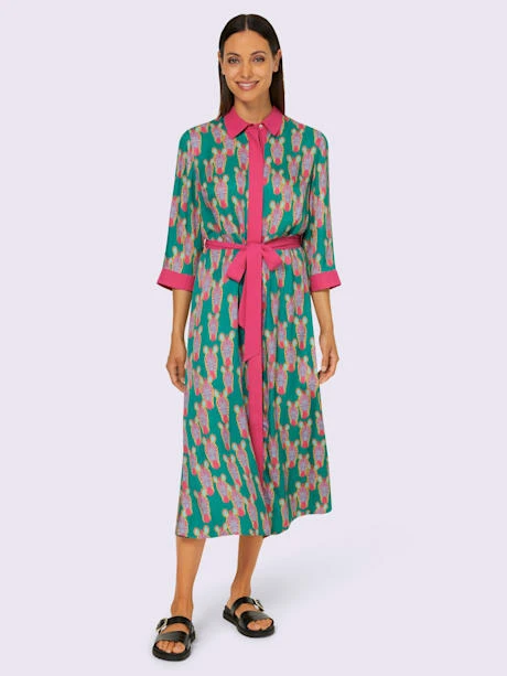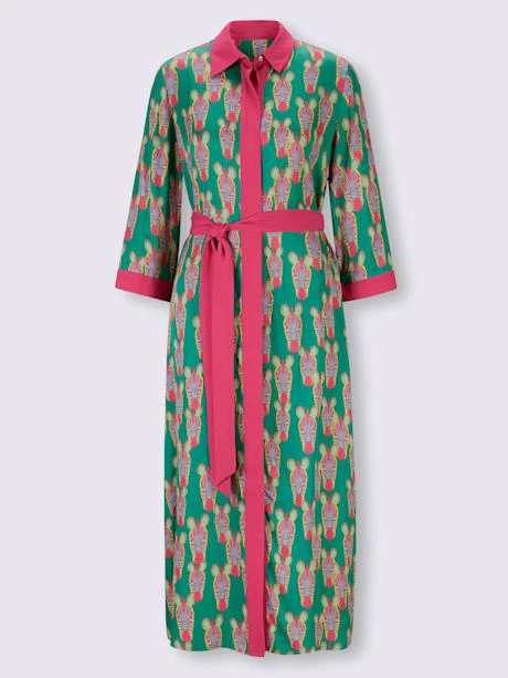 Robe imprimée au motif zèbre original et contrastes tendance. Qualité tissée. Longueur mollet. Col chemise et pinces poitrine tendance. Patte de boutonnage dissimulée sur toute la longueur. Manches 3/4 tendance avec manchettes boutonnées. Ceinture à nouer et passants.