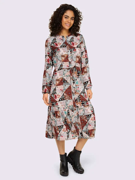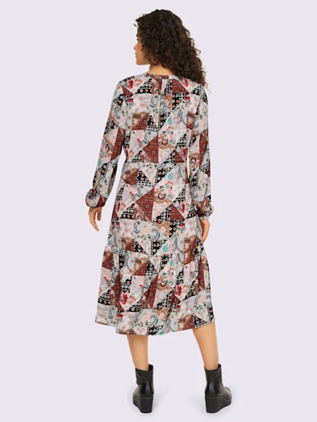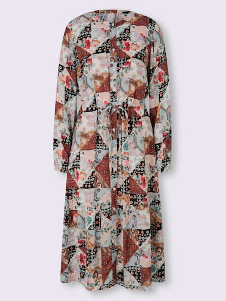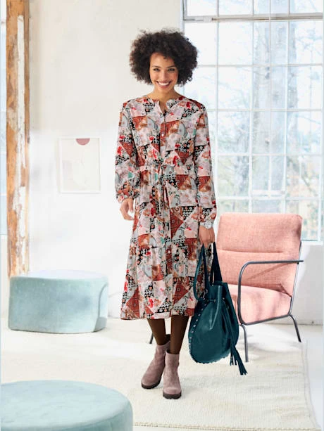 Robe imprimée féminine au motif patchwork. Encolure ronde, patte de boutonnage intégrale en imitation nacre, manches longues élastiquées. Taille avec coulisse et lien à nouer. Jupe longueur mollet avec finition volants. Très fluide, avec doublure en jersey.
