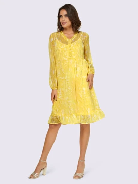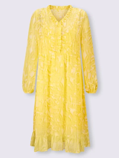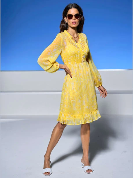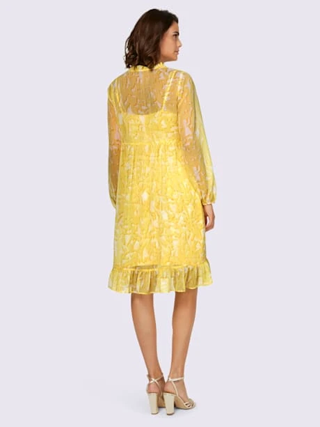 Robe imprimée féminine avec volants à l’encolure en V et à l’ourlet. Légèrement transparente au niveau des manches 3/4 et du décolleté. Nervures décoratives affinantes. Fond de robe joliment imprimé détachable par bouton-pression. Qualité légère.