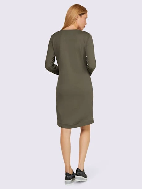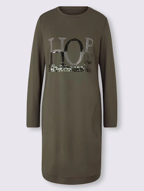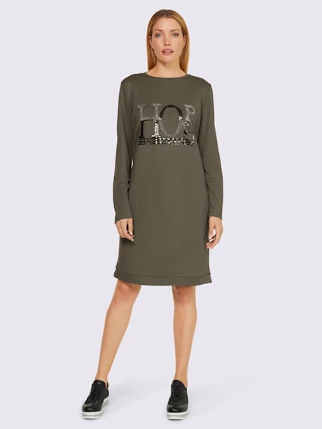 Robe légère avec inscription ornée de paillettes et de pierres fantaisie. Qualité douce et fluide facile à enfiler. Encolure ronde, manches longues et poches latérales fendues.