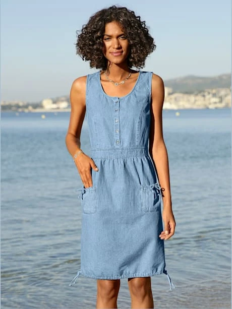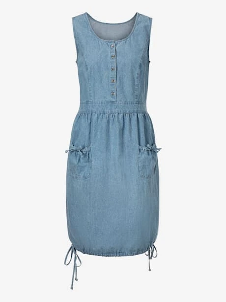 Robe légère en imitation denim. Col rond, patte de boutonnage jusqu’à la taille et fentes latérales. Facile à enfiler et à enlever grâce à la glissière latérale. 2 poches plaquées avec rubans décoratifs. Cordon à l`ourlet pour ajuster la largeur.