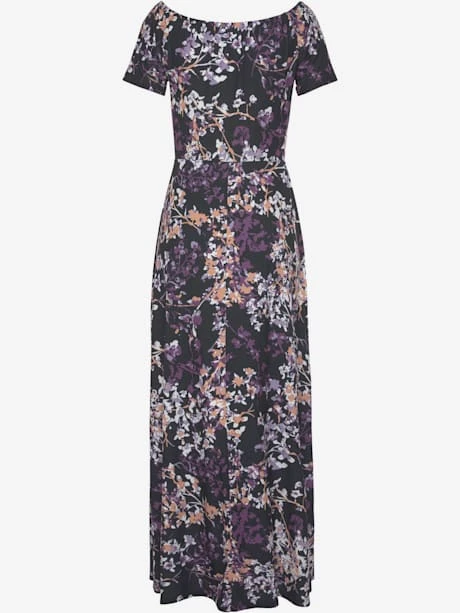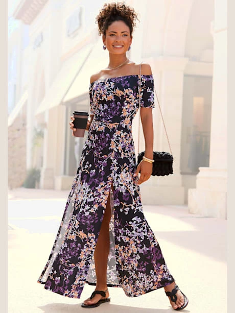 Robe longue Vivance. Imprimé floral sur toute la surface. Effet de couleur différent pour chaque pièce. Encolure Carmen avec manches courtes. Fentes à l’ourlet à l’avant de la jupe. Coupe étroite. Parfaite également pour se promener en bord de mer ou flâner en ville. Qualité lisse et extensible.