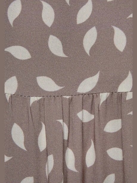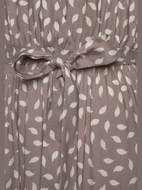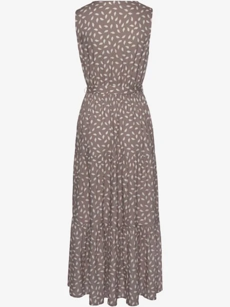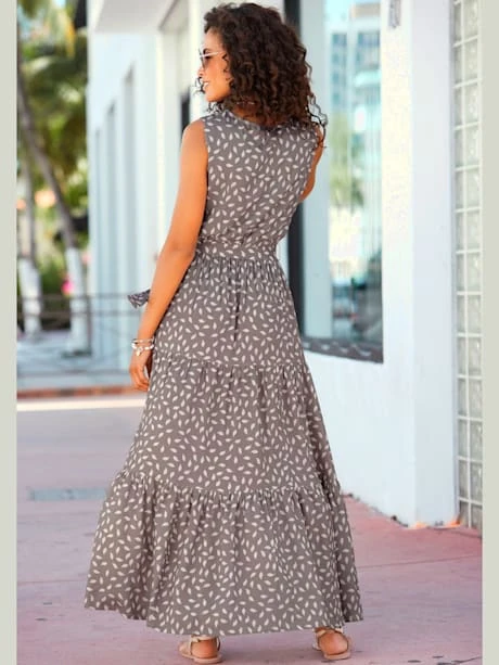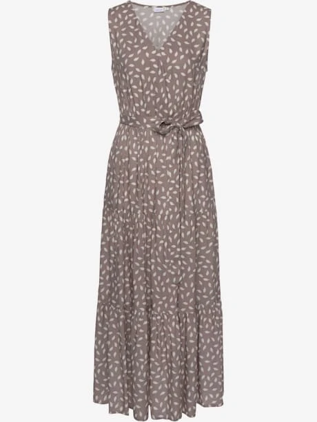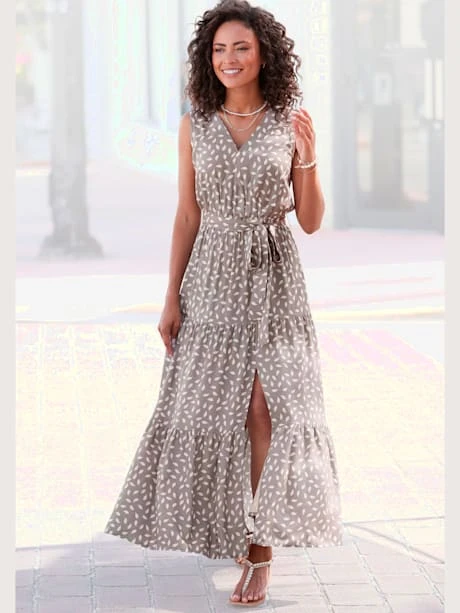 Robe longue imprimée de Vivance. Encolure en V. Sans manches. Taille élastiquée. Partie jupe à niveaux, ourlet fendu. Tissu agréable à porter.