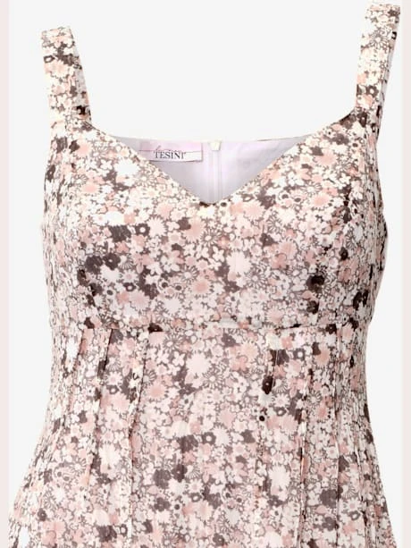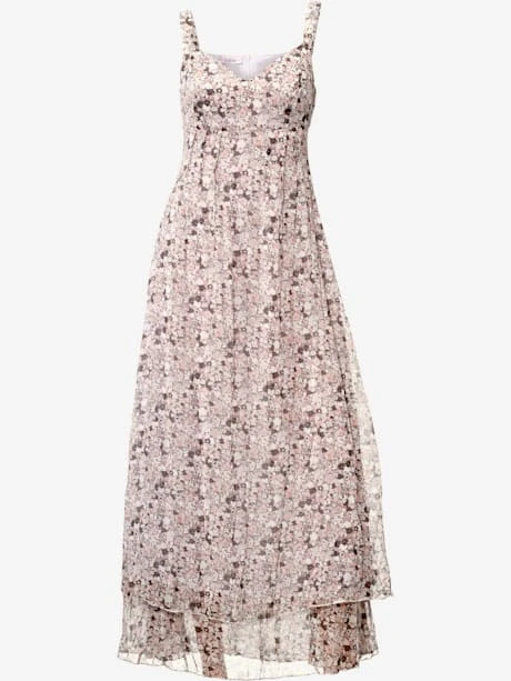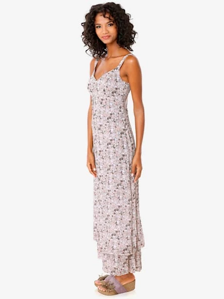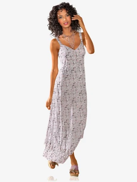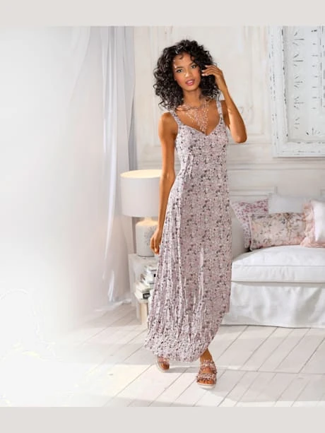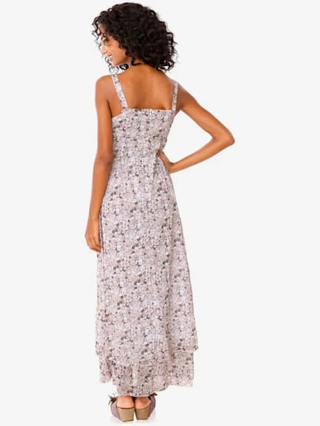 Robe longue au style romantique. Matière fluide. Haut ajusté, partie jupe évasée.