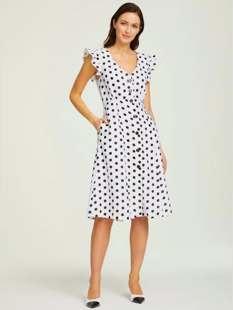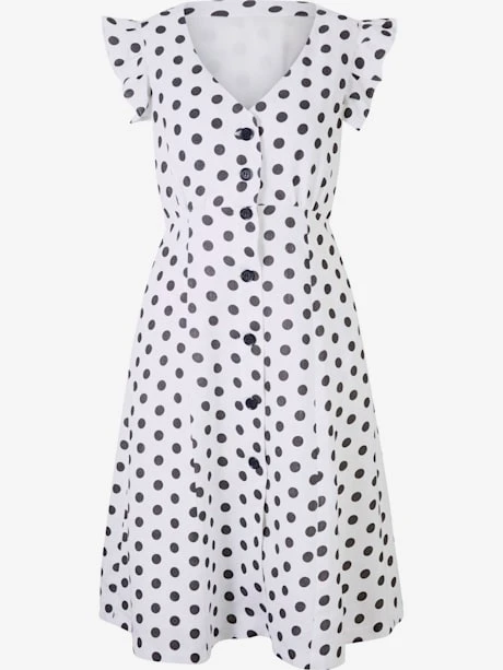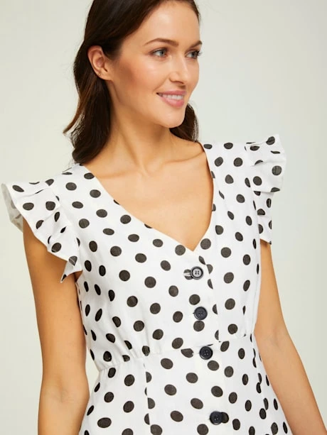 Robe féminine en qualité lin légère et agréable à porter. Volants fantaisie et joli motif à pois. Haut cintré avec encolure en V et mancherons. Couture haute à la taille, jupe très évasée et patte de boutonnage sur toute la longueur.