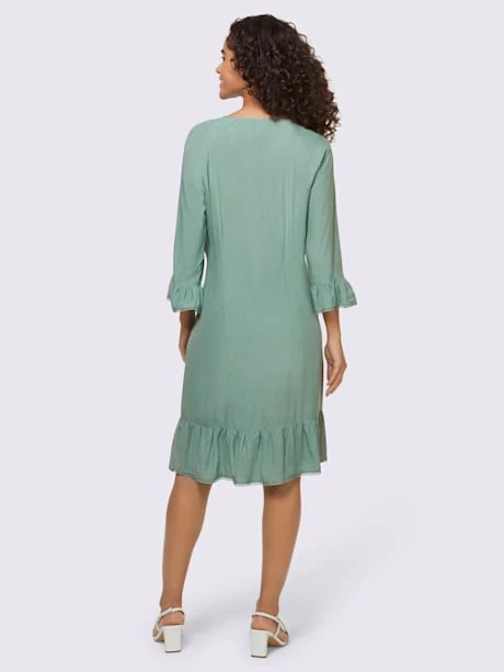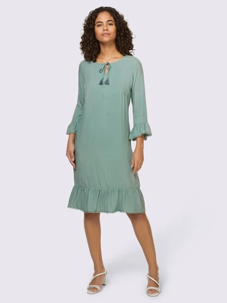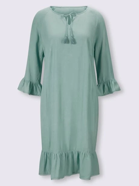 Robe en qualité viscose très douce. Coupe droite classique facile à enfiler. Encolure ronde avec petit V et lien à nouer avec glands. Manches style 3/4 avec bordure en dentelle à l’ourlet.