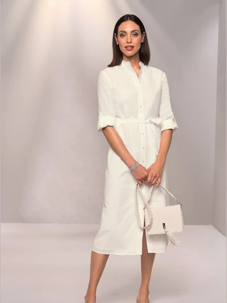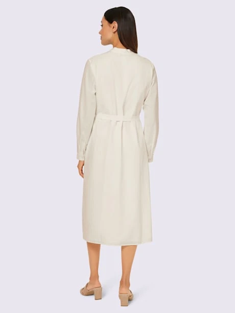 Robe en superbe imitation lin. Manches longues raffinées retroussables avec bride et bouton. Patte de boutonnage sur toute la longueur, petit col montant et ceinture à nouer pour souligner le style robe-chemisier. Soutient l’initiative Cotton made in Africa.