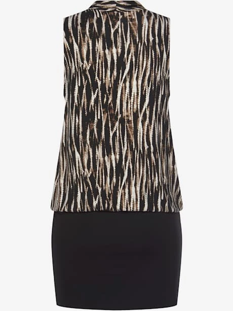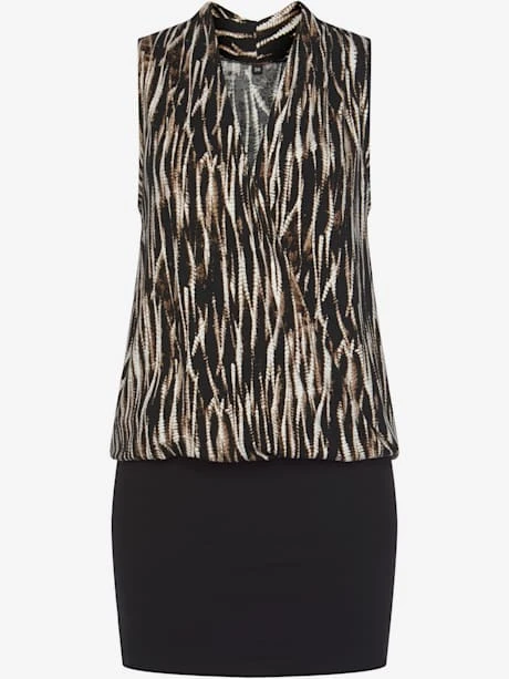 Robe VIVANCE, aspect 2 en 1. Haut imprimé. Effet de couleur différent pour chaque pièce. Encolure en V chevauchante avec bouton-pression. Taille élastiquée. Partie jupe unie. Longueur jupe env. 30 cm. 95% viscose, 5% élasthanne.