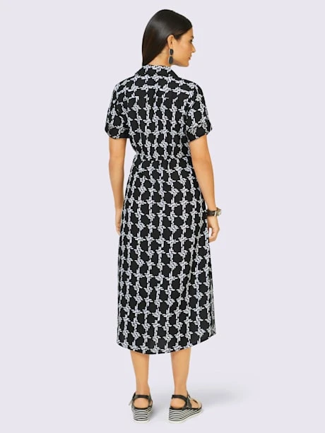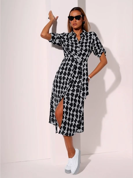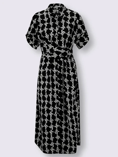 Superbe imprimé : robe avec col chemisier, patte de boutonnage sur toute la longueur, manches 3/4 réglables en longueur et ceinture raffinée asymétrique à nouer. Grandes fentes latérales pour un tombé affinant et une liberté de mouvement optimale. Élastique au dos à la taille et partie jupe évasée pour dissimuler les rondeurs.