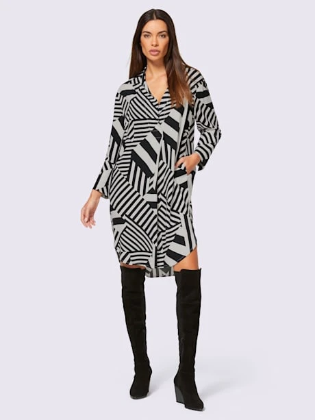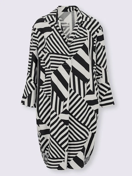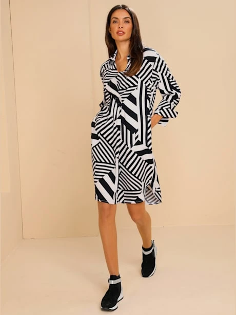 Robe au motif graphique exceptionnel. Encolure en V, ourlet arrondi et manches longues avec larges manchettes boutonnées. Qualité crêpe agréable à porter et fluide.