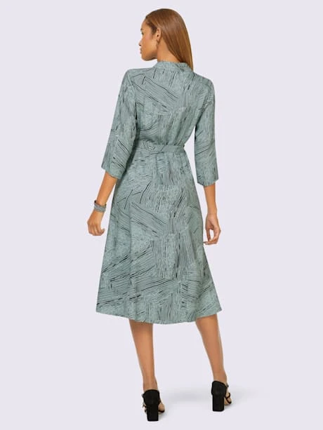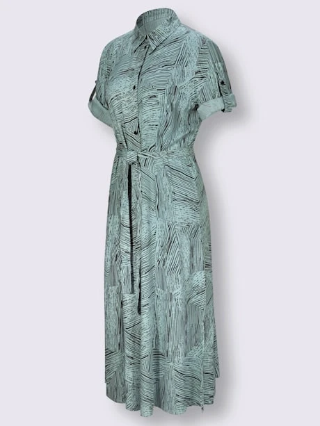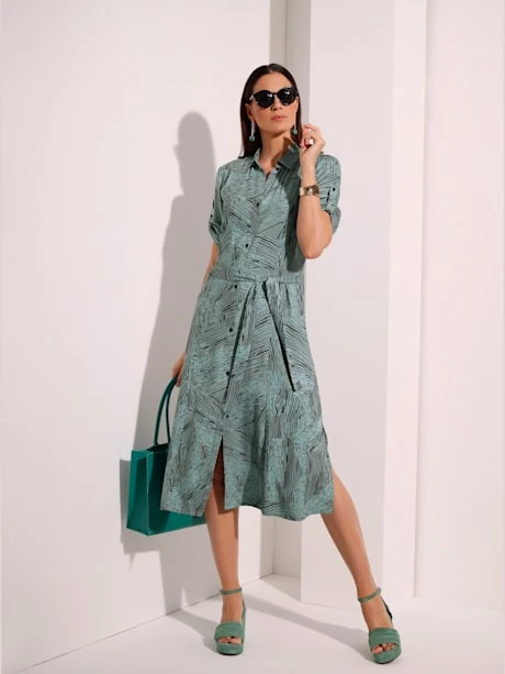 Magnifique robe imprimée 100% viscose douce et fluide avec partie jupe légèrement évasée pour une silhouette affinée. Col chemisier, patte de boutonnage sur toute la longueur, passants et manches 3/4 tendance à revers fixe, réglables en longueur grâce à la bride et au bouton. Jolie ceinture à nouer amovible assortie. Coutures structurantes pour une coupe parfaite. Fentes latérales pour faciliter les mouvements.