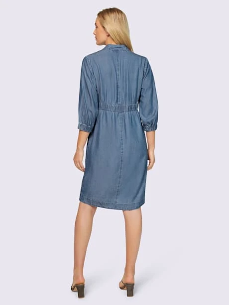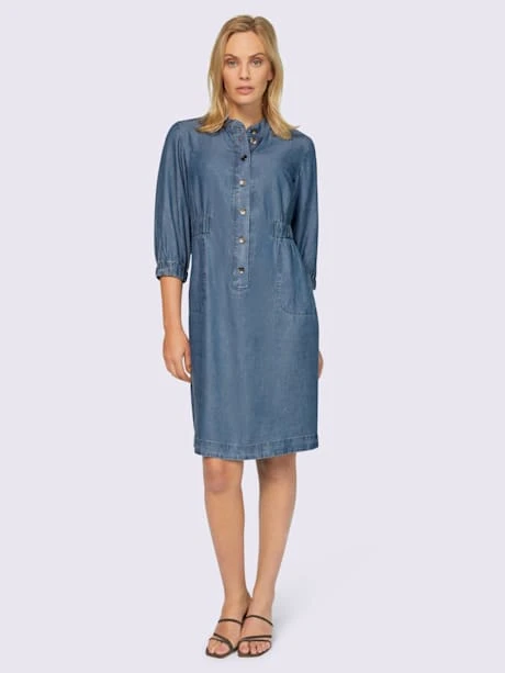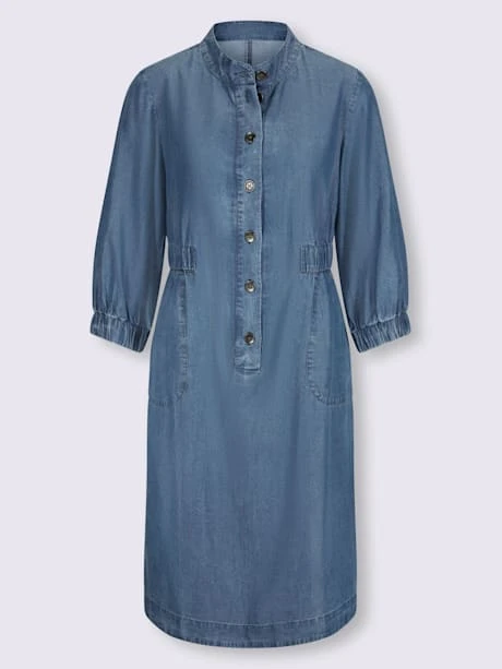 Robe en qualité lyocell ultra-légère, imitation jean tendance. Col montant et patte de boutonnage jusqu’aux hanches. Poches fendues plaquées. Ceinture élastique froncée à la taille. Manches 3/4 avec lien élastiqué.