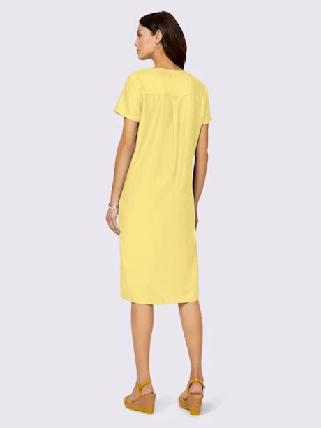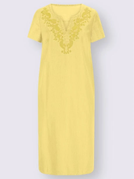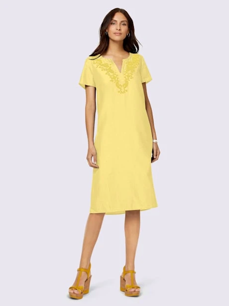 Incroyablement légère et agréable ! Robe tunique coupe droite avec superbe broderie autour de l’encolure ronde et en V. Parfaite pour l’été. Empiècement et pli au dos pour plus d’ampleur. 2 poches cousues pratiques. Pinces poitrine structurantes et manches courtes mode. Les robes imitation denim sont dotées d’un mélange de fibres naturelles composé de coton respirant et de lyocell rafraîchissant. Couleur citron en pur coton.