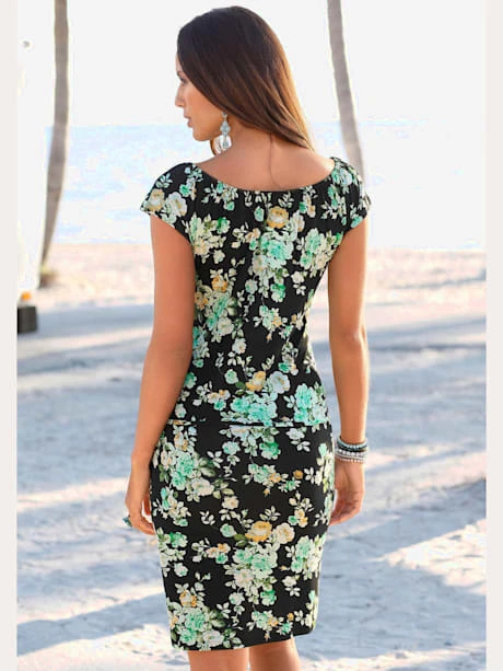 Robe imprimée. Effet de couleur différent pour chaque pièce. Ceinture à nouer aux hanches. Longueur env. 86 cm. 100% viscose.